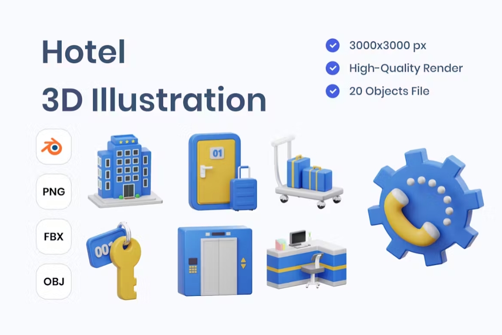 20 ready made 3D Hote Illustrations file objects for Websites, Mobile Apps and more. Enhance your designs with 3D Assets.