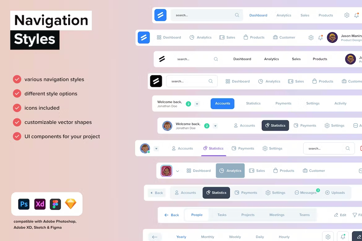 - Compatible with Adobe Photoshop, Adobe XD, Sketch and Figma
