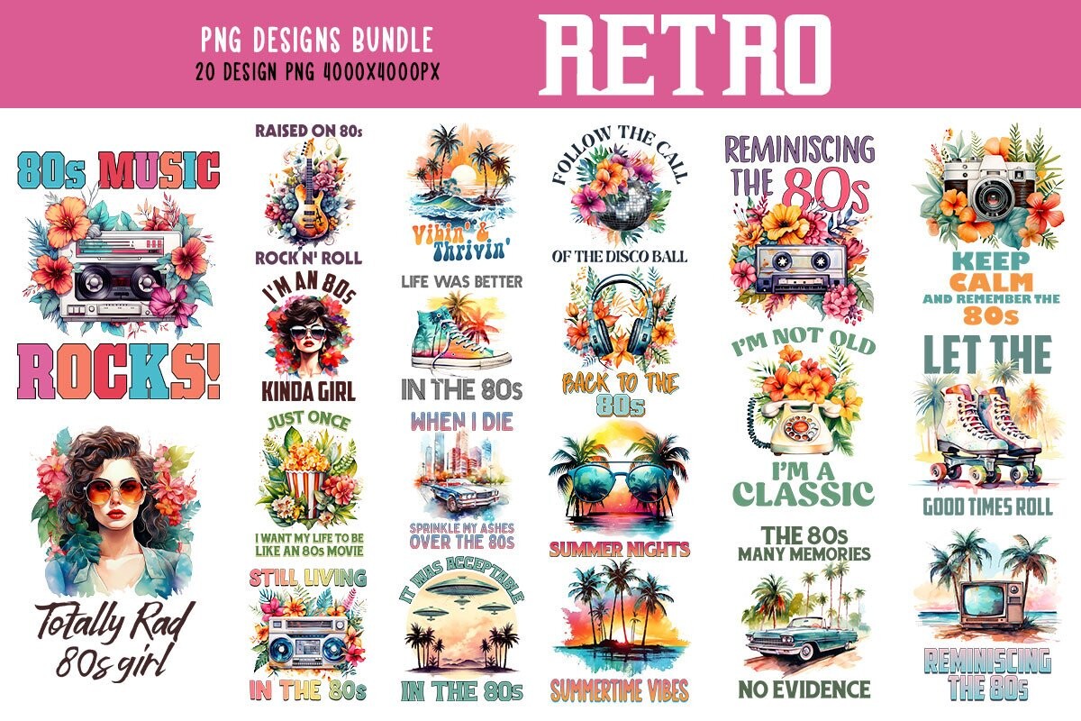You will receive an amazing collection of 80S Retro Vibes Bundle in various colors and styles. This set can be used for prints, t shirts, mugs, bags, posters, wall prints, frame artwork, phone cases, stickers, books, KDP, etc. Also great for design, social media and many more.